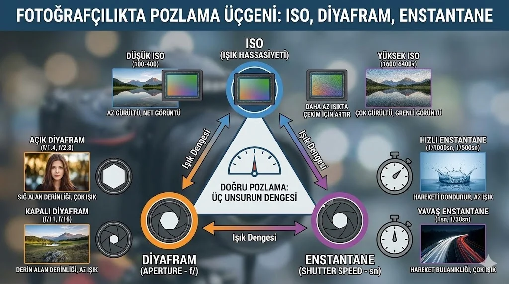 ISO, Diyafram ve Enstantane... Bu üçlünün dansını öğrenmeden profesyonel fotoğraf çekim teknikleri tam olarak uygulanamaz. Işığı dengelemek ve doğru pozlamayı yakalamak, teknik bilginin zirvesidir.